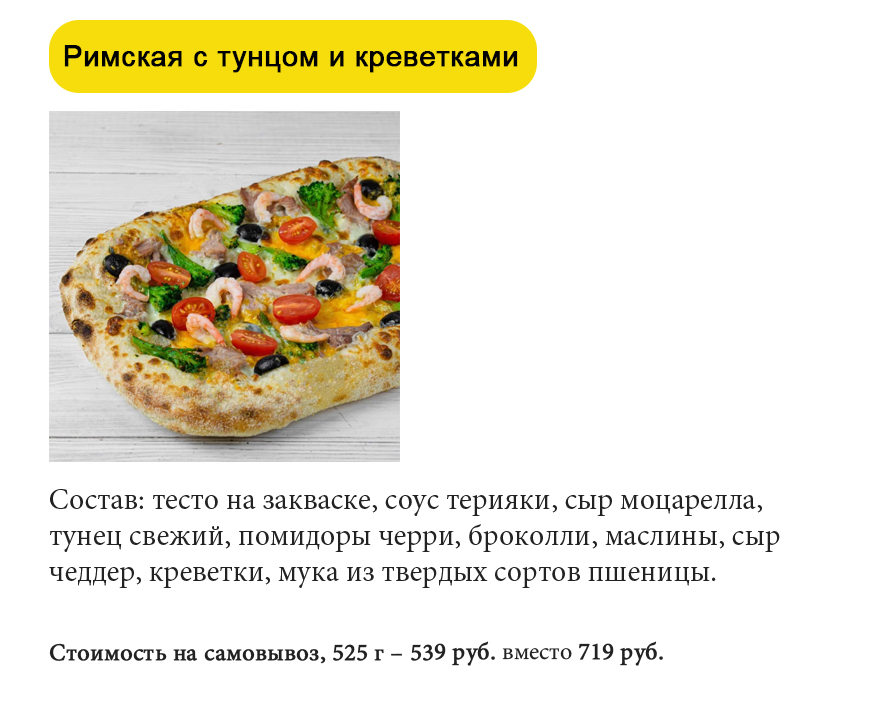 Состав: Тесто на закваске, соус терияки, сыр моцарелла, тунец свежий, помидоры черри, броколли, маслины, сыр чеддер, креветки, мука из твердых сортов пшеницы.
