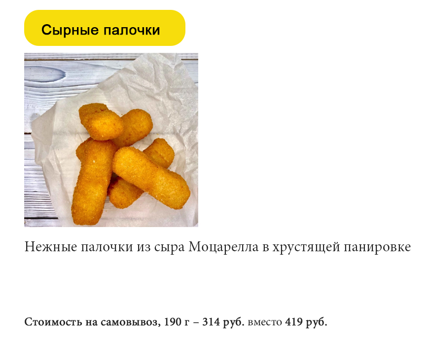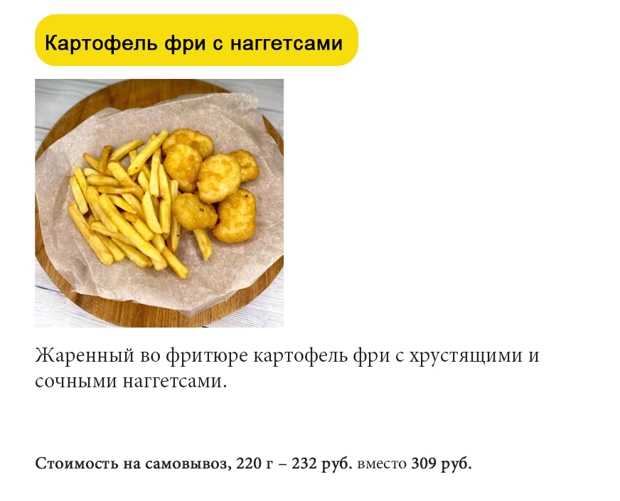 Стоимость на самовывоз, 540 г – 442 руб. вместо 589 руб.ФРИ-МЕНЮ (РАЗДЕЛ ЗАКУСКИ) ПО АКЦИИ: