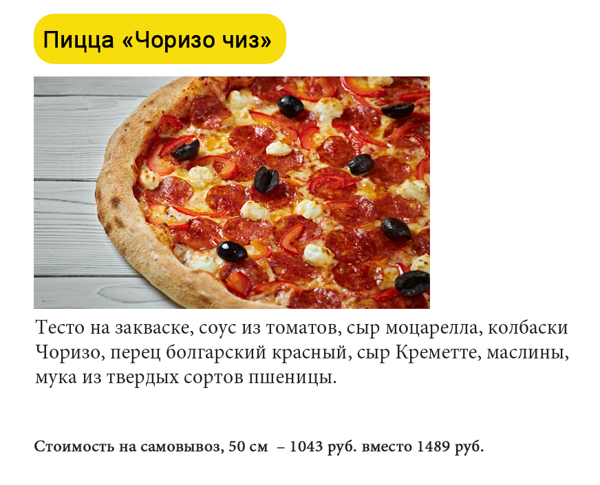 Стоимость на самовывоз, 50 см – 1141 руб. вместо 1629 руб.Пицца «Чоризо чиз»