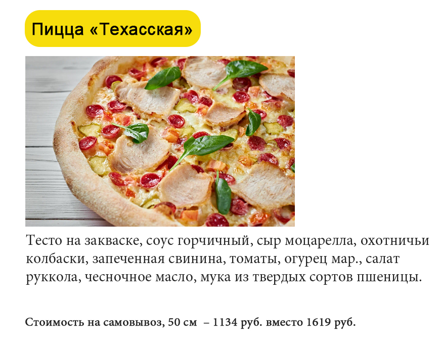 Стоимость на самовывоз, 50 см – 1008 руб. вместо 1439 рубПицца «Техасская»
