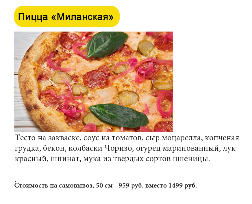 Стоимость на самовывоз, 50 см – 810 руб. вместо 1349 руб.Пицца «Миланская»
