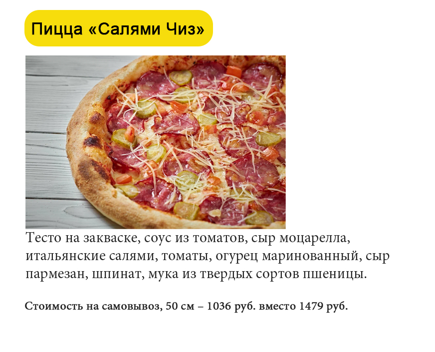 Стоимость на самовывоз, 50 см - 959 руб. вместо 1499 руб.Пицца «Салями Чиз»