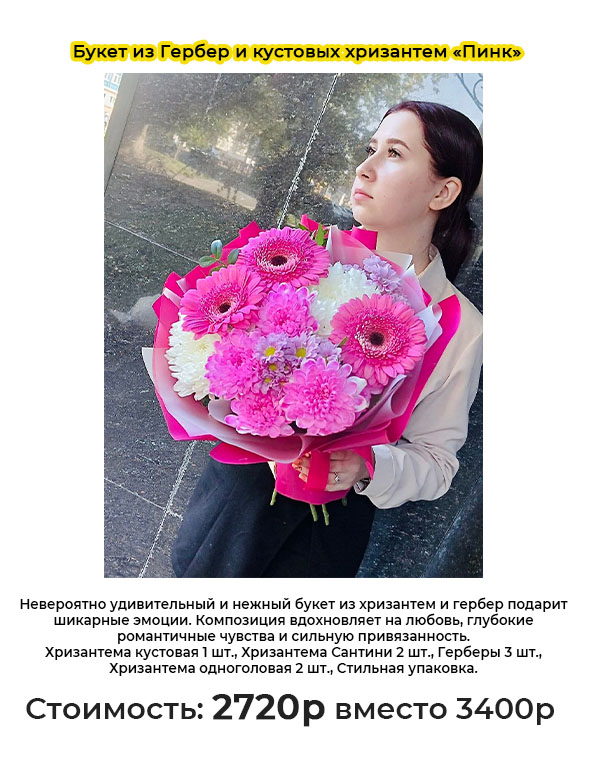 • Букет из Гербер и кустовых хризантем «Пинк»- 2720 руб. вместо 3400 руб. (Купон за 99 руб.)