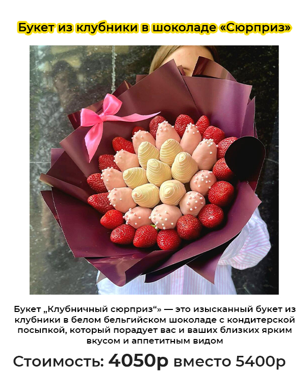 • Букет из клубники в шоколаде «Сюрприз» - 4050 руб. вместо 5400 руб. (Купон за 219 руб.)