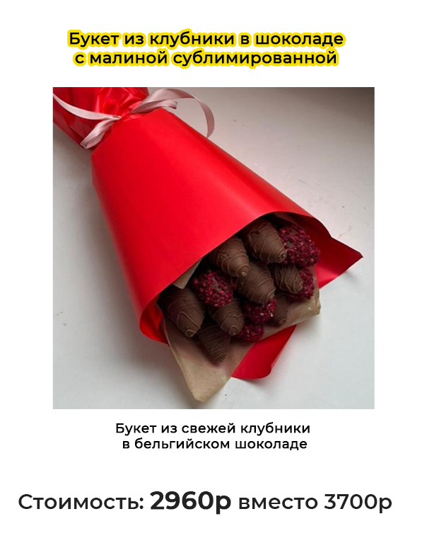 • Букет из клубники в шоколаде с малиной сублимированной - 2960 руб. вместо 3700 руб. (Купон за 119 руб.)