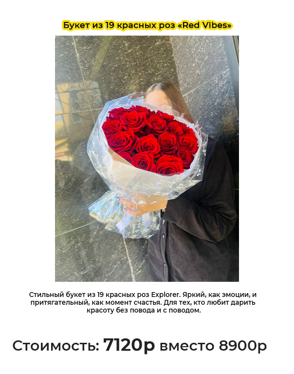 • Букет из 19 красных роз «Red Vibes» - 7120 руб. вместо 8900 руб. (Купон за 299 руб.)