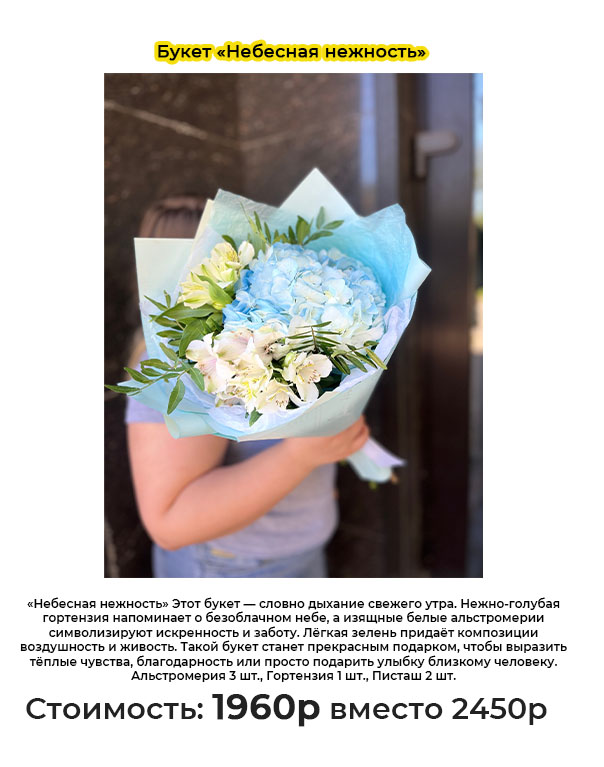 Состав: «Небесная нежность» Этот букет — словно дыхание свежего утра. Нежно-голубая гортензия напоминает о безоблачном небе, а изящные белые альстромерии символизируют искренность и заботу. Лёгкая зелень придаёт композиции воздушность и живость. Такой букет станет прекрасным подарком, чтобы выразить тёплые чувства, благодарность или просто подарить улыбку близкому человеку.