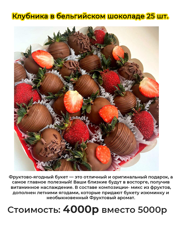 • Клубника в бельгийском шоколаде, 25 шт. - 4000 руб. вместо 5000 руб. (Купон за 159 руб.)