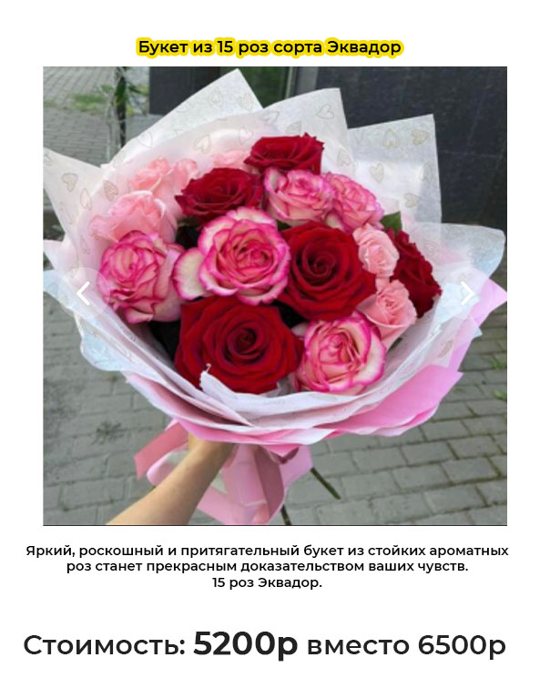 • Букет из 15 роз сорта Эквадор - 5200 руб. вместо 6500 руб. (Купон за 219 руб.)