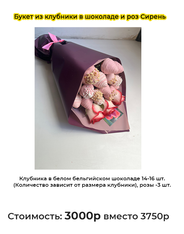 • Букет из клубники в шоколаде и роз Сирень - 3000 руб. вместо 3750 руб. (Купон за 119 руб.)