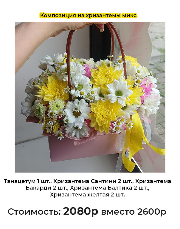 • Композиция из хризантемы микс- 2080 руб. вместо 2600 руб. (Купон за 69 руб.)