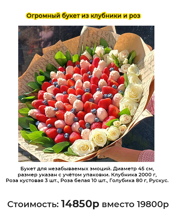 • Огромный букет из клубники и роз - 14 850 руб. вместо 19 800 руб. (Купон за 989 руб.)