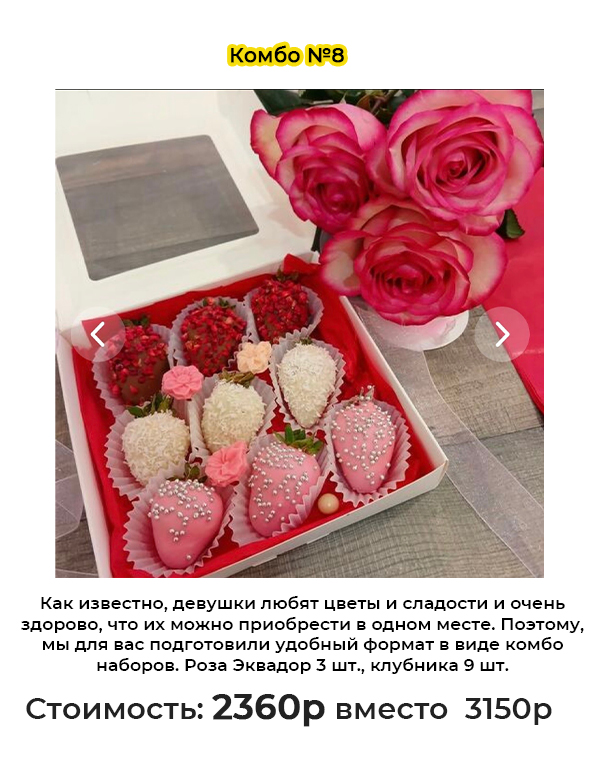 Состав: Как известно, девушки любят цветы и сладости и очень здорово, что их можно приобрести в одном месте. Поэтому, мы для вас подготовили удобный формат в виде комбо наборов.