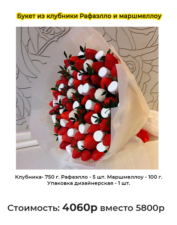 • Букет из клубники Рафаэлло и маршмеллоу - 4060 руб. вместо 5800 руб. (Купон за 299 руб.)