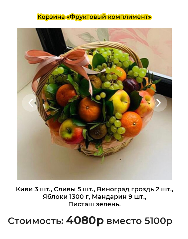 Состав: Киви 3 шт., Сливы 5 шт., Виноград гроздь 2 шт., Яблоки 1300 г, Мандарин 9 шт., Писташ зелень.