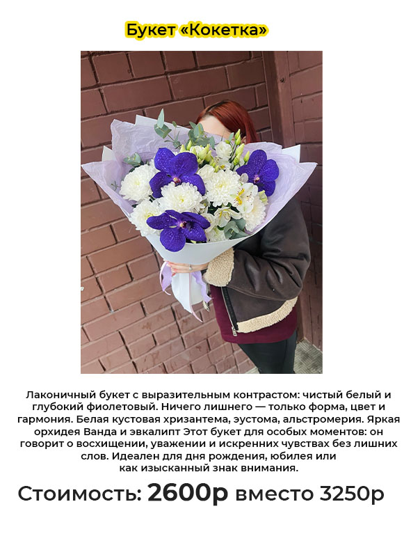 Состав: Лаконичный букет с выразительным контрастом: чистый белый и глубокий фиолетовый. Ничего лишнего — только форма, цвет и гармония. Белая кустовая хризантема, эустома, альстромерия. Яркая орхидея Ванда и эвкалипт Этот букет для особых моментов: он говорит о восхищении, уважении и искренних чувствах без лишних слов. Идеален для дня рождения, юбилея или как изысканный знак внимания.