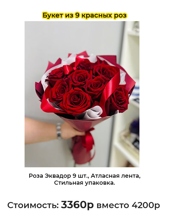 • Букет из 9 красных роз - 3360 руб. вместо 4200 руб. (Купон за 159 руб.)