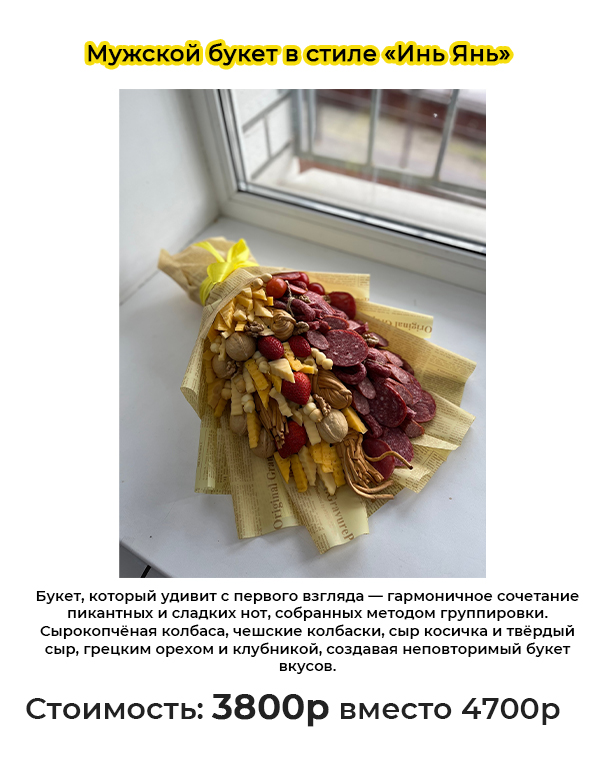 Состав: Букет, который удивит с первого взгляда — гармоничное сочетание пикантных и сладких нот, собранных методом группировки. Сырокопчёная колбаса, чешские колбаски, сыр косичка и твёрдый сыр, грецким орехом и клубникой, создавая неповторимый букет вкусов.