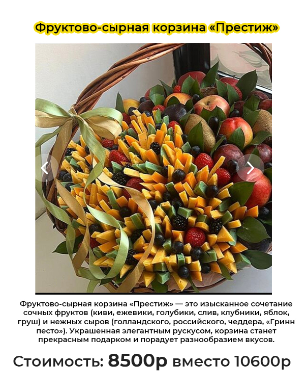 • Фруктово-сырная корзина «Престиж» - 8500 руб. вместо 10 600 руб. (Купон за 399 руб.)