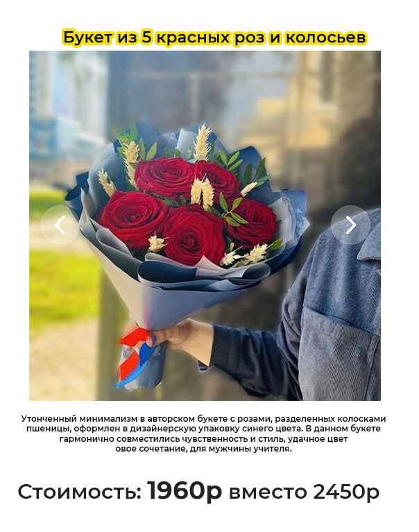• Букет из 5 красных роз и колосьев - 1960 руб. вместо 2450 руб. (Купон за 69 руб.)