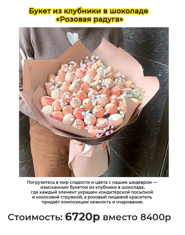 • Букет из клубники в шоколаде «Розовая радуга» - 6720 руб. вместо 8400 руб. (Купон за 299 руб.)