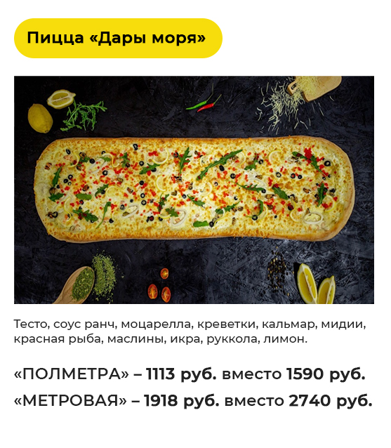 Тесто, соус ранч, моцарелла, креветки, кальмар, мидии, красная рыба, маслины, икра, руккола, лимон.