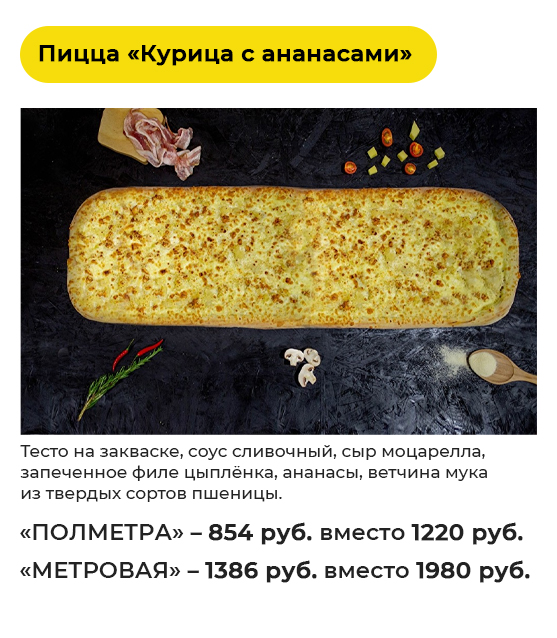 Тесто на закваске, соус сливочный, сыр моцарелла, запеченное филе цыплёнка, ананасы, ветчина мука из твердых сортов пшеницы.