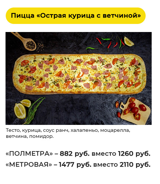 Тесто, курица, соус ранч, халапеньо, моцарелла, ветчина, помидор.