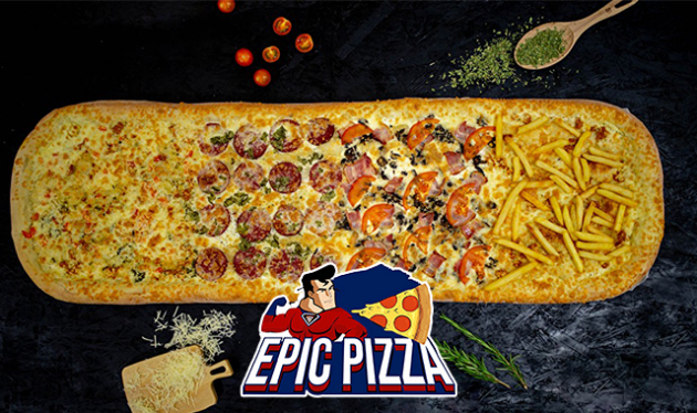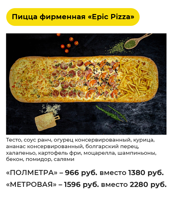 • Купон даёт скидку до 50% на выделенное меню от службы доставки «Epic Pizza».