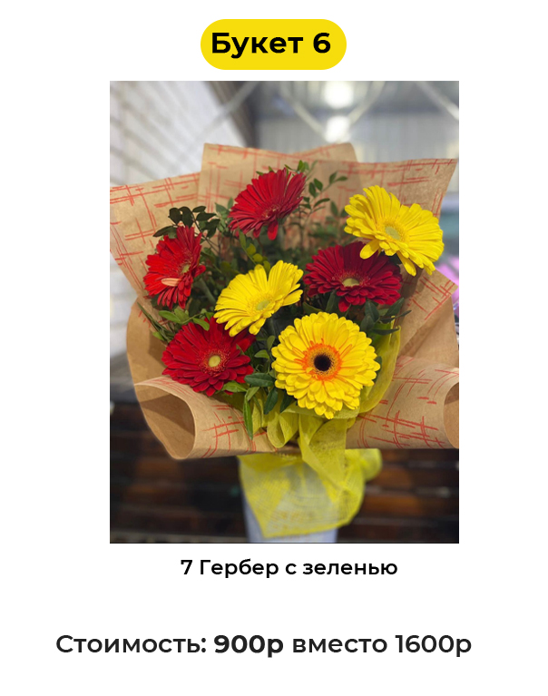 Букет 6 «7 Гербер с зеленью» - 900 руб. вместо 1600 руб. (Купон за 119 руб.)