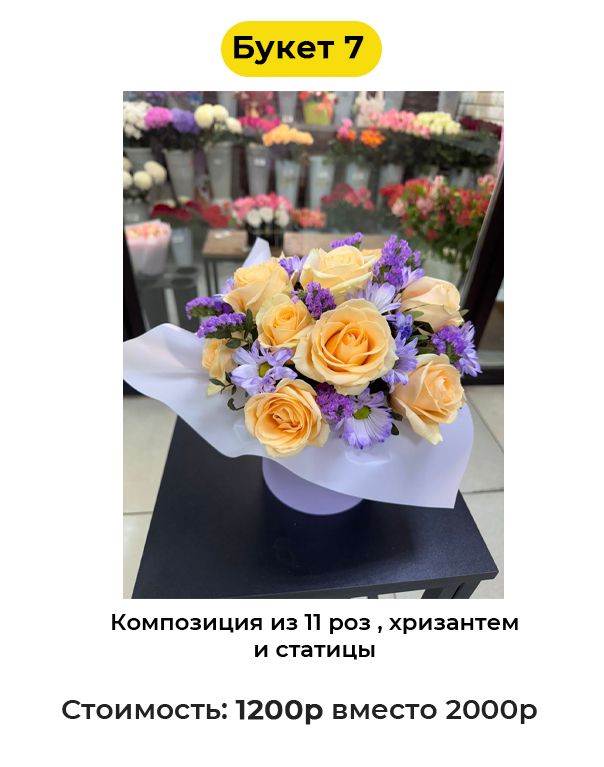 Букет 7 «Композиция из 11 роз , хризантем и статицы» - 1200 руб. вместо 2000 руб. (Купон за 119 руб.)