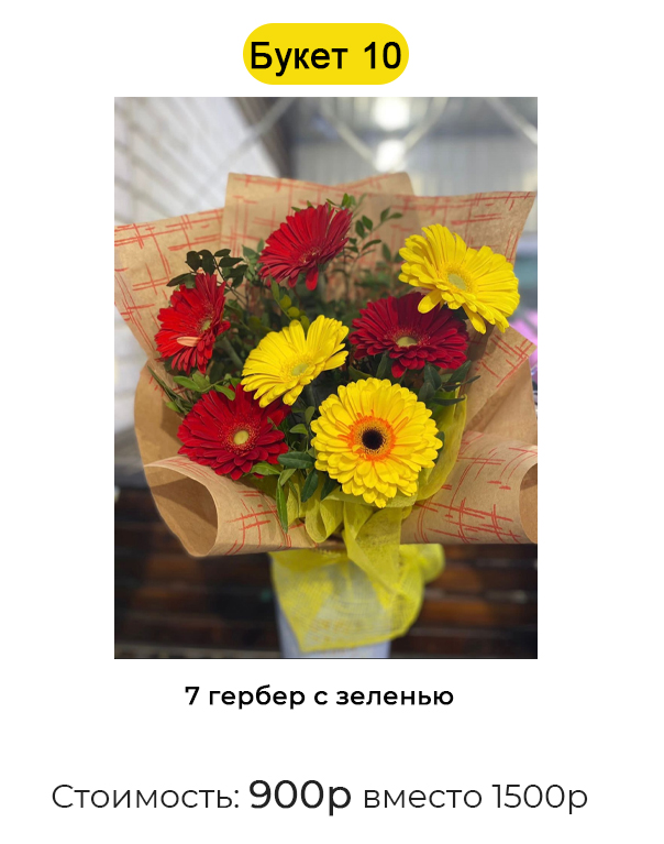 Букет 10 «7 гербер с зеленью» - 900 руб. вместо 1500 руб. (Купон за 99 руб.)