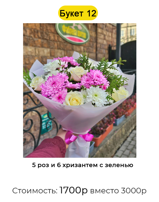 Букет 12 «5 роз и 6 хризантем с зеленью» - 1700 руб. вместо 3000 руб. (Купон за 199 руб.)