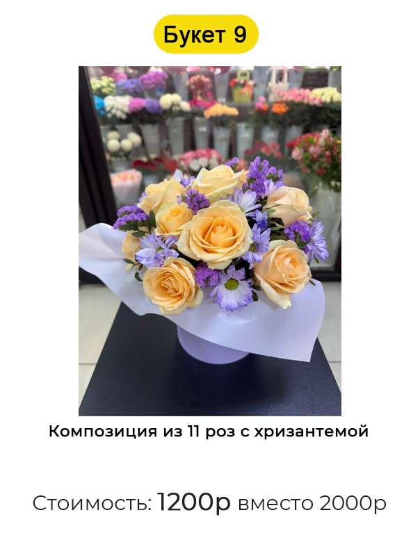 Букет 9 «Композиция из 11 роз с хризантемой» - 1200 руб. вместо 2000 руб. (Купон за 119 руб.)