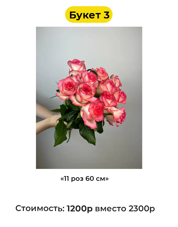 • Букет 3 «11 роз 60 см» - 1200 руб. вместо 2300 руб. (Купон за 199 руб.)