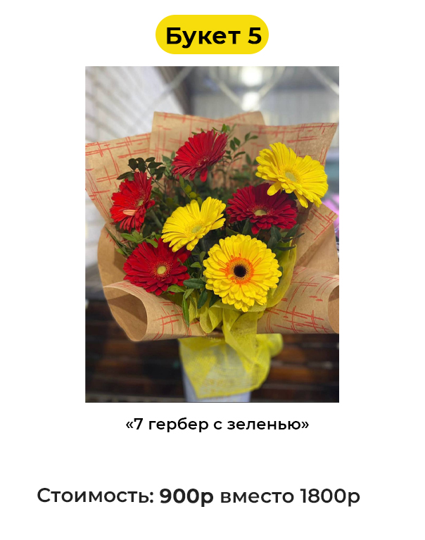 • Букет 5 «7 гербер с зеленью» - 900 руб. вместо 1800 руб. (Купон за 119 руб.)