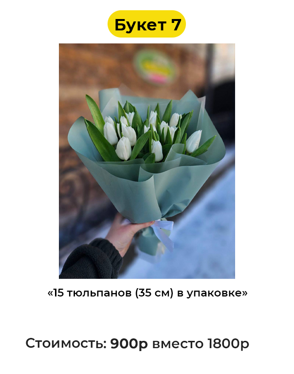 • Букет 7 «15 тюльпанов (35 см) в упаковке» - 900 руб. вместо 1800 руб. (Купон за 119 руб.)