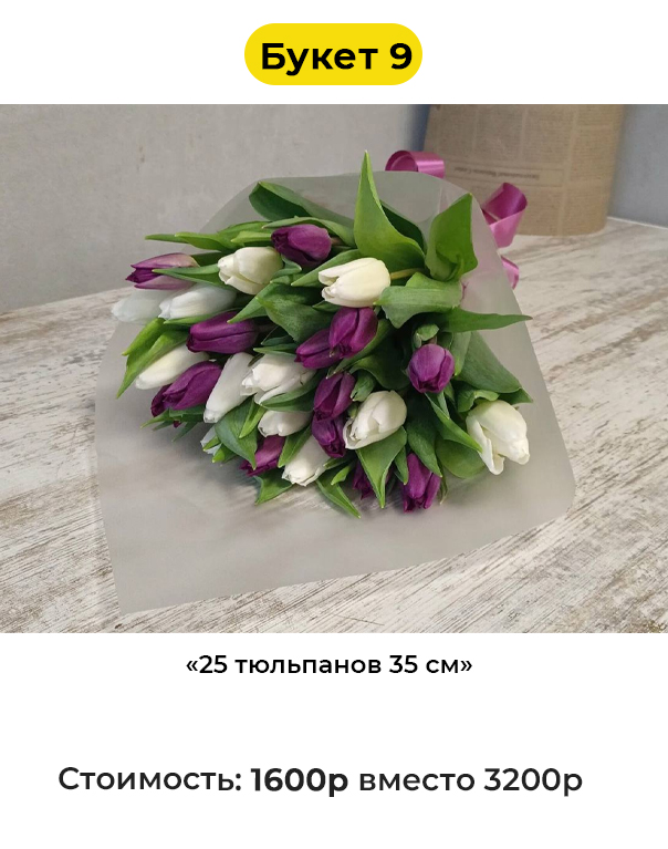 • Букет 9 «25 тюльпанов 35 см» - 1600 руб. вместо 3200 руб. (Купон за 249 руб.)