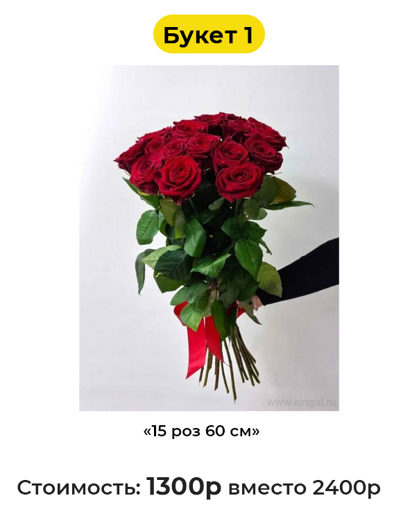 • Букет 1 «15 роз 60 см» - 1300 руб. вместо 2400 руб. (Купон за 199 руб.)