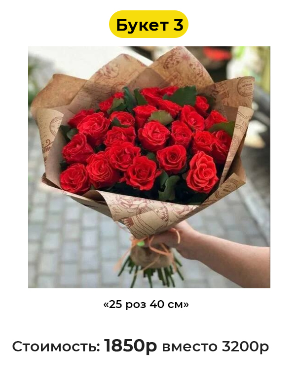 • Букет 3 «25 роз 40 см» - 1850 руб. вместо 3200 руб. (Купон за 229 руб.)