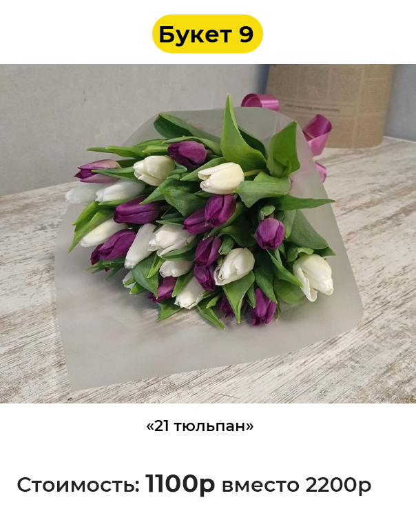 • Букет 9 «21 тюльпан» - 1100 руб. вместо 2200 руб. (Купон за 199 руб.)