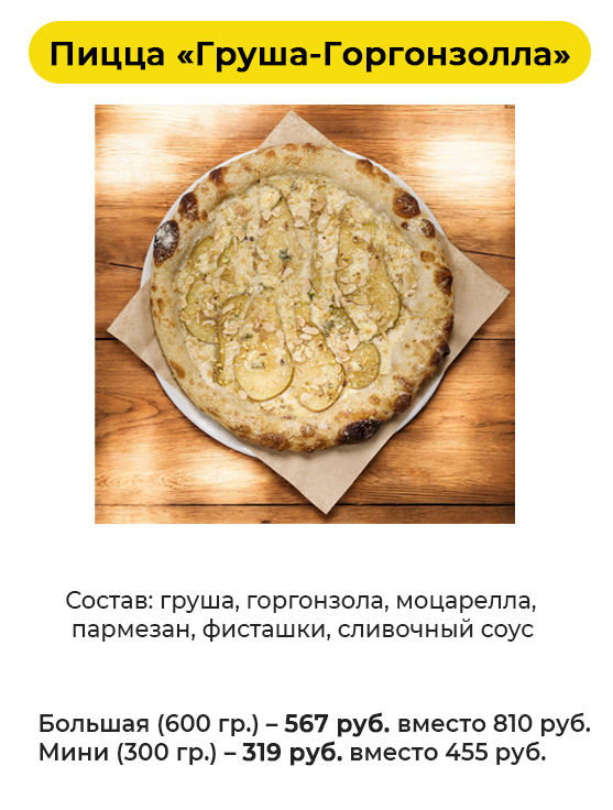 Состав: груша, горгонзола, моцарелла, пармезан, фисташки, сливочный соус