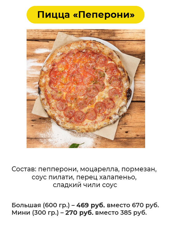 Мини (260 гр.) – 322 руб. вместо 460 руб.1 купон = 1 пицца. со скидкой