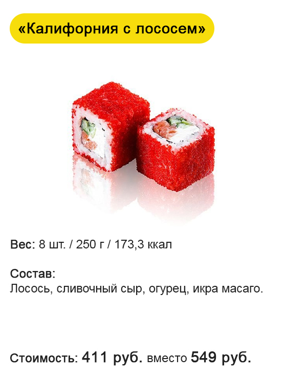 • Запеченный лосось Лемонграсс (8 шт/ 270 г/ 243.1 ккал) – 449 руб. вместо 599 руб.