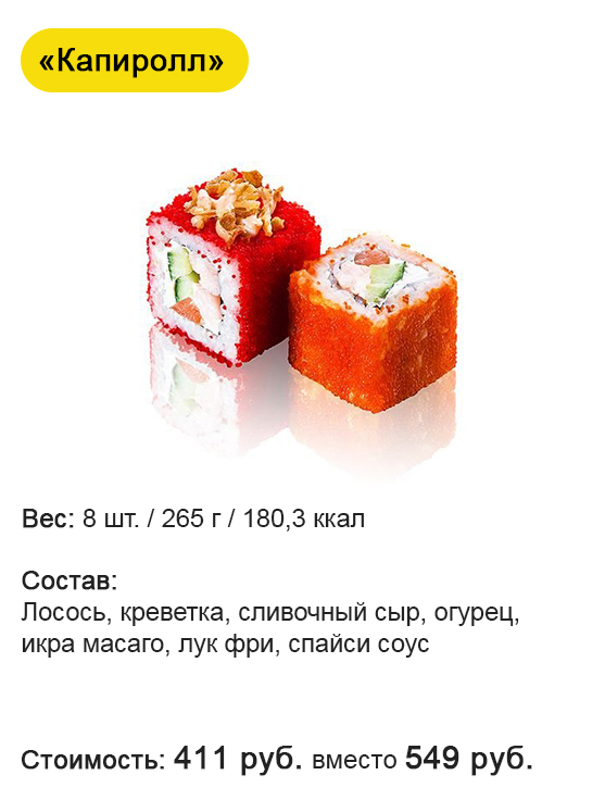 ✓ Капиролл (лосось, краб (имитация), огурец, сыр, икра масаго, лук фри, спайси соус);