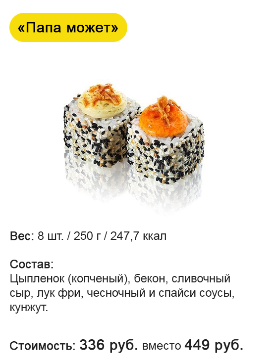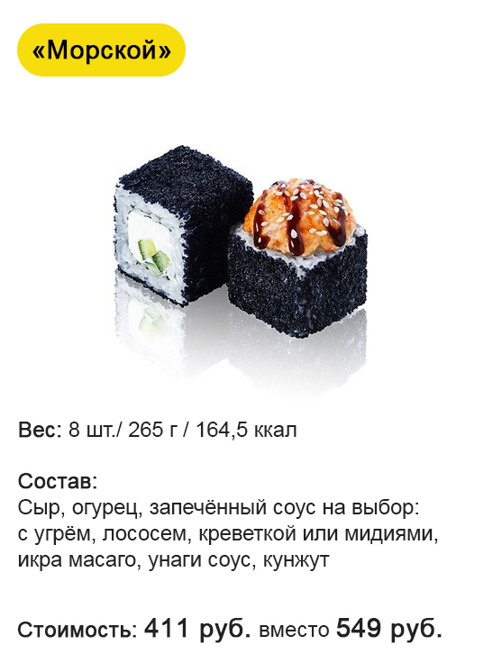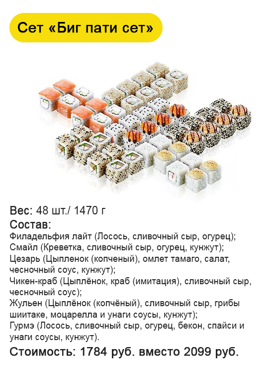 • VIP-сет (50 шт/ 1640 г/ 197.2 ккал) – 2626 руб. вместо 3089 руб.