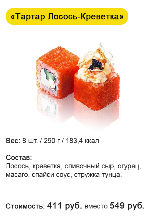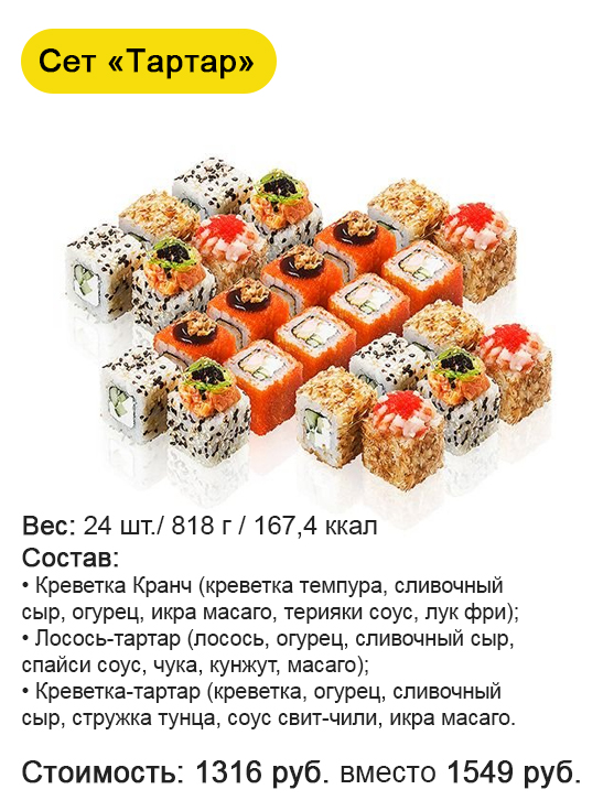 • Сет Тартар (24 шт/ 818 г/ 167.4 ккал) – 1317 руб. вместо 1549 руб.