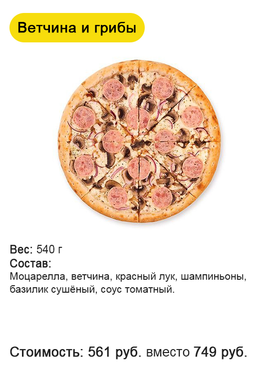 Состав: соус "Томатный", моцарелла, ветчина, шампиньоны, маринованные огурчики, базилик сушеный.=> Посмотреть все ПИЦЦЫ на сайте Капибара*