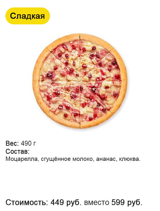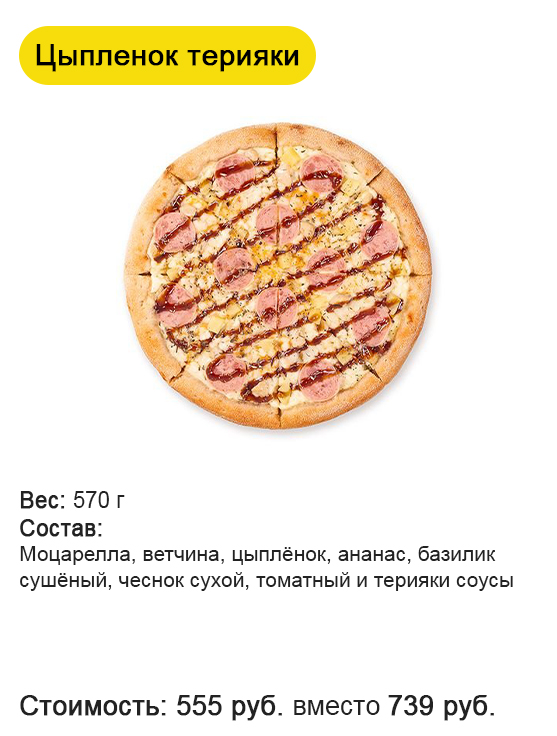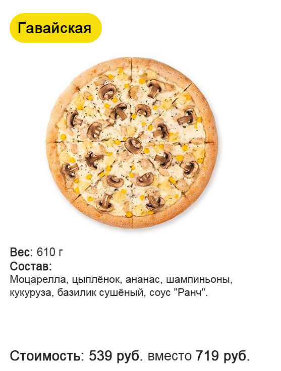 • Гавайская (32 см/ 610 г/ 283 ккал) – 539 руб. вместо 719 руб.