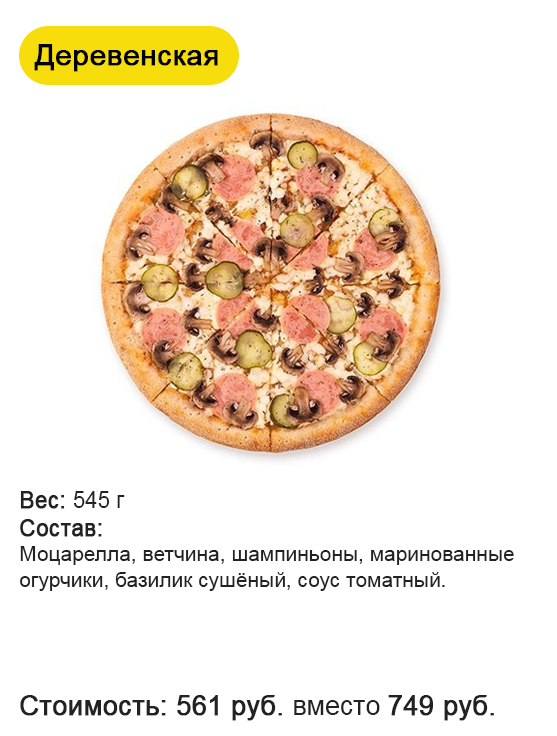 • Деревенская (32 см/ 545 г/ 232.5 ккал) – 561 руб. вместо 749 руб.